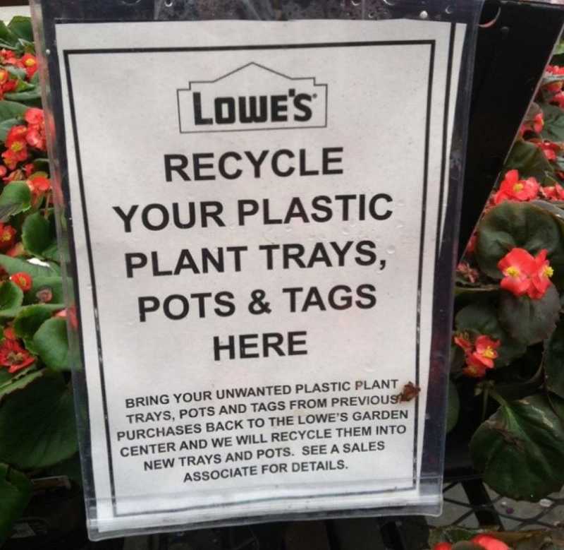- Indoor/Outdoor Plants: Your green thumb can help your plants bloom and contribute to sustainability. Flowers and plants typically come in plastic containers — instead of throwing them out, check to see if your curbside recycling program accepts them. If not, drop them at participating retailers so they can be recycled into new products like pots and trays.